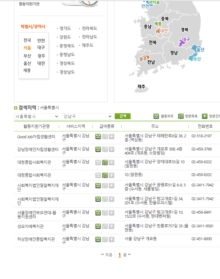 본인이 거주하시는 곳을 선택 후 군, 구 를 추가 선택 입력을 하시면 더욱더 자세한 장애인활동지원사(보조사) 교육기관, 장애인 활동지원센터 및 협회를 찾을 수 있습니다.