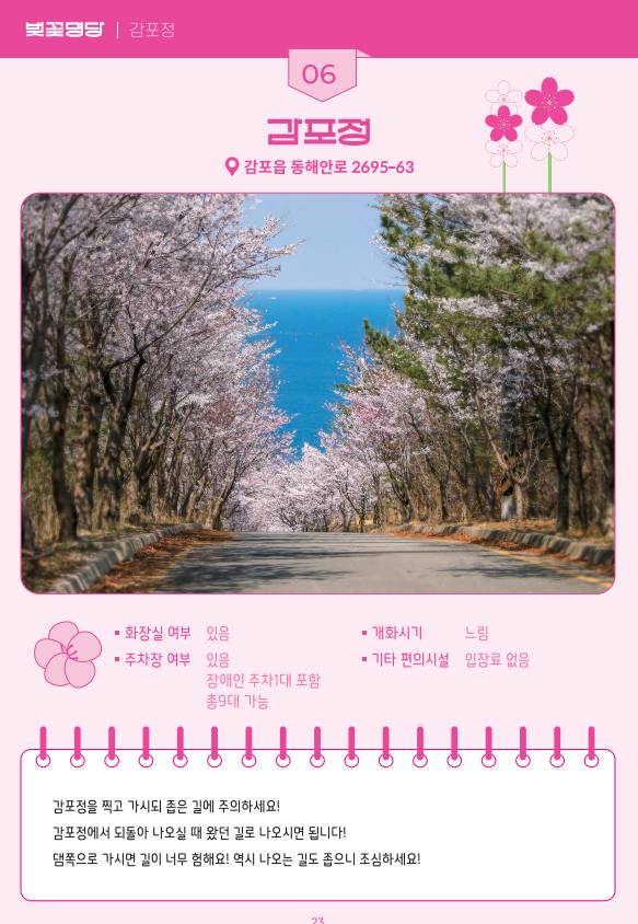 총 8군데의 벚꽃 명당이 있으며 축제장과 다르게 각종 편의시설이 부족하지만 벚꽃만큼은 잊히지 않을 만큼 아름답고 예쁜 벚꽃을 보실 수 있습니다.